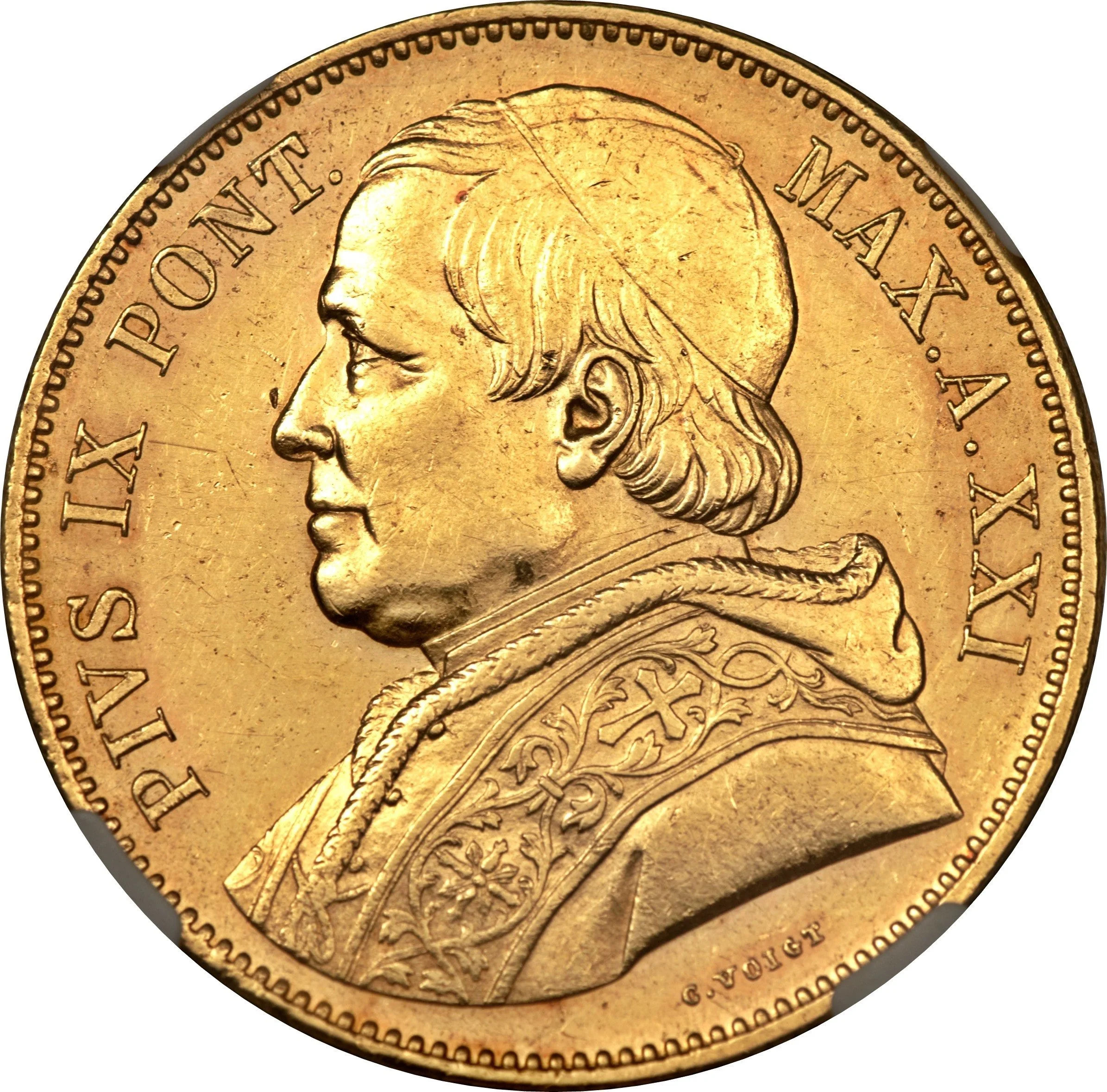 Sur les pièces de monnaie émises dans les Etats Pontificaux on peut voir le nom du Pape suivi de Pontifex Maximus ou de son abréviation “Pont. Max.”.